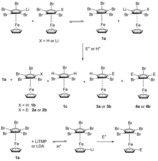 But in addition to hydrolysis reactions, there were also other side reactions at work that led to complicated product mixtures. In several cases, products could be identified that contained more Br substituents than the starting materials. In some cases, mass spectrometry revealed that products had formed that contained substituents on both Cp rings. Such observations are usually made when “halogen dance reactions” are at work. This type of reaction is usually observed with halogen-substituted heterocycles, especially with iodides and bromides, and has been known for quite a while [34], but its mechanism is still being discussed today [35]. Only recently it could be shown that bases like KOtBu or KN(SiMe3)2 catalyze halogen dance reactions in bromopyridines, if added in small amounts to the stoichiometric base LDA [36]. More important in the present context is that such reactions also occur in metallocene chemistry [37], and that it is possible to use them for stereoselective synthesis [17,38,39]. Scheme 7 shows how such a halogen dance can produce a complex product mixture just by occurring once.