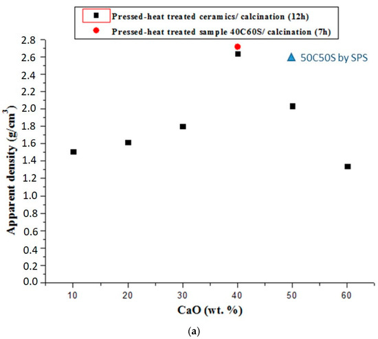 The CaO/SiO2 ratio is considered an important factor that affects the properties of the CaO-SiO2 composites. The apparent density and porosity of calcium-silicate-based ceramics prepared via conventional pressing and heat treatment in the air for 1 h at 800 °C using eggshells and silica gel as precursors are described in Figure 7. Their parameters (weight, size) before and after heat treatment in the air and their real images are presented in Table 1. Ten compositions were examined. It was reported that the values of the apparent density of 10C90S, 20C80S, 30C70S, 40C60Sˍ7h, 40C60S, 50C50S, and 60C40S compositions are 1.509, 1.619, 1.801, 2.719, 2.639, 2.037, and 1.341 g/cm3, respectively. The apparent porosity measurements were also conducted and reported as the following: 32.60%, 32.13%, 28.06%, 19.43%, and 54.78% for the compositions 10C90S, 20C80S, 30C70S, 50C50S, and 60C40S, respectively (Figure 7b). In the case of 40C60Sˍ7h and 40C60S compositions, almost no porosities were detected. It was demonstrated that the CaO/SiO2 ratio has a significant influence on the densification of the CaO-SiO2 ceramics. It can be seen from Figure 7a that the apparent density increased when the weight ratio of CaO/SiO2 increased from 0.11 (10/90) to 0.67 (40/60) corresponding to the CaO/SiO2 molar ratio from 0.119 to 0.714, and then subsequently decreased. The increase in the apparent density values from 1.509 to 2.639/2.719 g/cm3 (for 40C60S/40C60Sˍ7h compositions, respectively) when the weight CaO/SiO2 ratio increases from 0.11 to 0.67 could be ascribed to the densification of the composites due to the gradual diminishing of their pores. These results are in good agreement with the apparent porosity values and the SEM micrographs (Figure 5). The highest density value (Figure 7a), shrinkage in the dimensions, and mass loss were associated with the composition 40C60S where the fully densified and melted microstructure was observed (Figure 5d,e). The calcination duration of the eggshells caused a slight change in the density of the final outcomes, where the composition 40C60Sˍ7h seemed to be more dense compared to the composition 40C60S.