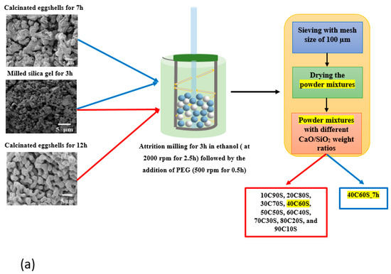 The attrition milling process was used to prepare calcium silicate powders from silica gel from desiccators and chicken eggshells as raw materials with initial CaO/SiO2 weight ratio that ranges from 10/90 to 90/10 (see Table 3). The eggshells were initially collected and washed with tap water. Thereafter, they were dried, broken by hand into small pieces, and then subjected to heat treatment in the air. The calcination process of the eggshell was performed at a high temperature of 900 °C for two different time regimes (heat treatment in the air for 7 h and 12 h) to extract the calcium oxide (CaO) with low impurities. The silica gel (SiO2, Chemolimpex, “A” quality 1–6 mm, Budapest, Hungary), on the other hand, was subjected to intensive ball milling (Fritsch GmbH, Idar-Oberstein, Germany) for 3 h in dry conditions using an alumina bowl (500 mL) and 10 balls of alumina. A highly efficient attrition mill (Union Process type 01-HD/HDDM) equipped with zirconia agitator delta discs and zirconia grinding media (zirconia balls, each one about 1 mm in diameter) in a zirconia tank was used for homogenization of the SiO2 particles in the CaO powder at 2000 rpm in 100 g of ethanol for 3 h. The rotation speed was changed to 500 rpm in the last half hour of milling upon the addition of 10 g of polyethylene glycol (PEG) to the powder mixtures (Table 2). The resulted powder mixtures were then dried and passed through a mesh with a size of 100 µm. Different CaO/SiO2 ratios were produced (Table 3).