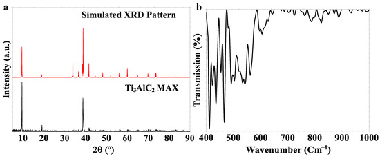 Characterization of the materials using (a) XRD for synthesized and simulated patterns of Ti3AlC2 material and (b) FT-IR.