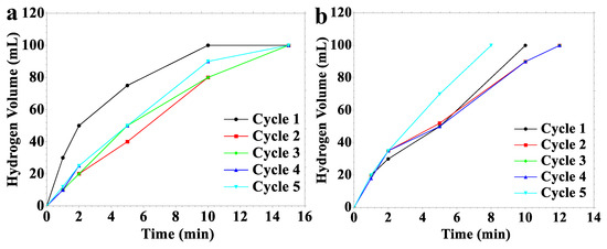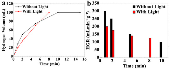 Hydrogen generation from NaBH4 hydrolysis is shown in Figure 6. The black line illustrates hydrogen evolution without illumination (Figure 6a). The volume of hydrogen increases consistently with time, attaining a plateau after roughly 10 min (Figure 6a). The hydrogen evolution was also recorded under illumination (Figure 6a). The hydrogen volume increased with a markedly accelerated rate relative to the dark situation, attaining a superior plateau value (Figure 6a).