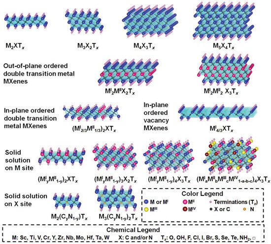 The structures and compositions of typical MXenes. In the formula of MXenes, which is Mn+1XnTx, M is an early transition metal, X is either carbon or nitrogen, and Tx is the symbol for surface terminations. A range of 1–4 is possible for the n value. One, two, or more transition metal atoms may occupy the M sites, leading to solid solutions or organized structures. Ordered double- transition metal MXenes can be found in various structures, including in-plane vacancy structures (i-MXenes) like Mo2/3CTx and (Mo2/3Y1/3)2CTx, and out-of-plane ordered structures (o-MXenes) like Cr2TiC2Tx or Mo2Ti2C3Tx, which consist of one or two layers of MII transition metal sandwiched between MI transition metals. Reprinted with permission from [24]. Copyright (2021), John Wiley and Sons.