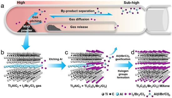 (a–d) A schematic illustrating the gaseous etching process for the fabrication of MXenes. Reprinted/adapted with permission from [38]. Copyright (2024) Elsevier.