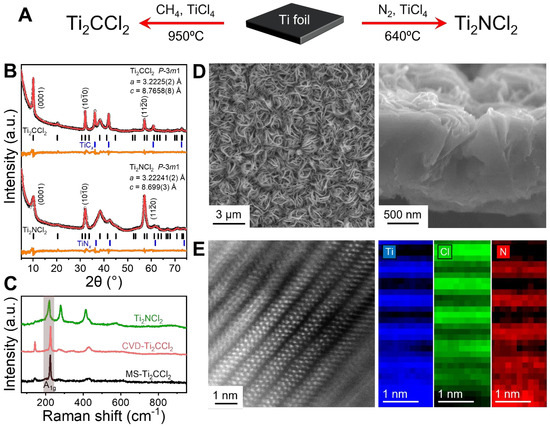 The growth of MXenes via CVD. (A) A visual representation of the CVD processes. (B) The XRD patterns and Rietveld refinement results for CVD-Ti2CCl2 and CVD-Ti2NCl2. (C) The Raman spectra of CVD-Ti2CCl2 and CVD-Ti2NCl2 MXenes compared to those of a conventional material. (D) Frontal and cross-sectional SEM images of CVD-Ti2CCl2. (E) High-resolution HAADF photographs and the EELS elemental distribution of CVD-Ti2NCl2. Reprinted with permission from [25]. Copyright (2023), Science.