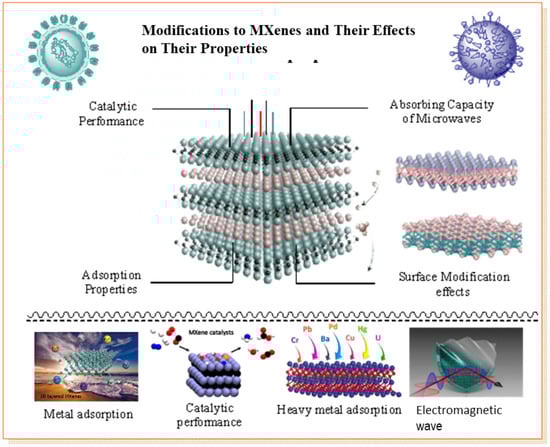 The poor interface binding strength that arises from the restricted compatibility between MXenes and hydrophobic polymers significantly impacts their overall mechanical qualities. It could be challenging to meet the performance requirements for specific application areas due to the small diversity of hydrophilic functional groups. For instance, opposing electric terminal groups (–F, –OH) make electrical energy storage inefficient because they hinder the diffusion of Li+ and Na+ ions and the mobility of electrolyte ions. The ability of a MXene-based battery to store energy is significantly reduced as a result of this [90]. Hence, controlling the MXene interface relies heavily on altering the MXene surface (Figure 5) [91].