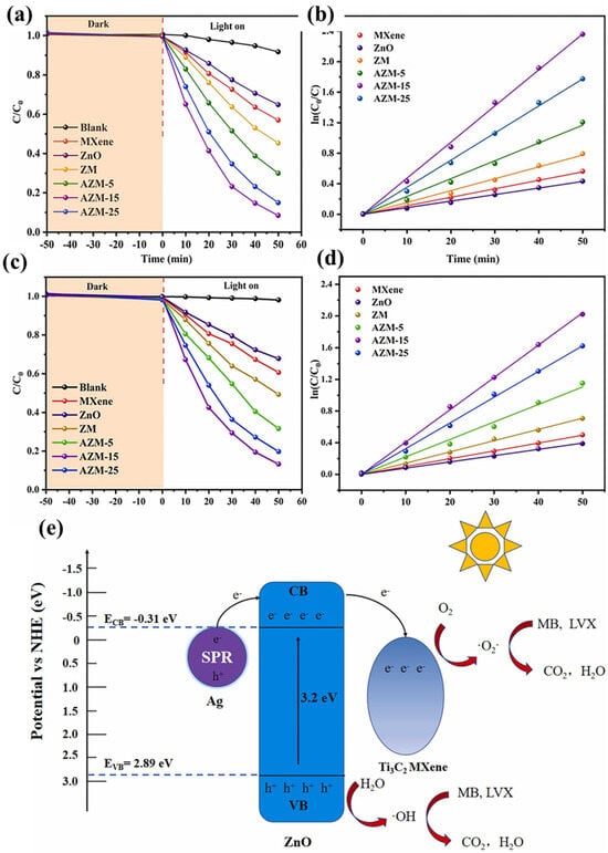 A simple hydrothermal and chemical deposition approach produces an MXene heterojunction by hybridizing ZnO and Ag nanoparticles with the MXene (Ag@ZnO@Ti3C2 ternary composite) by Liu et al. To boost the photocatalytic activity of MXene, the combination of Ag and ZnO may effectively compensate for its narrow bandgap, separate the charge carriers, and increase the absorption of visible light. One way to measure the AZM’s photocatalytic activity is to see how well it removes methylene blue dye and levofloxacin when exposed to visible light. Figure 7a shows that even after 50 min of dark stirring, the MB concentration had not dropped much, suggesting that the adsorption interaction between methylene blue and the hydrocarbons and anions present was mild. After 50 min of visible-light irradiation, the MB elimination rate was 8.31% without a photocatalyst. This is likely because the spectra of the light emitted by the irradiation coincides with the MB peak absorbance. Figure 7a,c show that when it comes to MB and LVX photodegradation performance, the ZM composite is better than pure MXene. Because of the Ag particles’ SPR impact, the AZM samples show much better photocatalytic degradation than the ZM samples. Figure 7b,d provide a rate graph that plots ln(C0/C) against time to better quantify the deterioration rate [127]. The primary species involved in the photodegradation of MB and LVX, as shown by the outcomes of trapping tests and EPR, are ·OH and ·O2−. This study offers a means to develop novel bandgap photocatalysts that can degrade organic pollutants photocatalytically, which may help reduce environmental pollution.