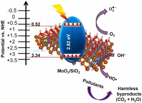 Hydrothermal synthesis of one-dimensional molybdenum oxide nanobelts was carried out by Abo-Dief et al. Using ultrasonication, MoO3/SiO2/MXene binary and ternary composites were created. Two organic dyes, crystal violet, and methyl orange (MO), were tested for their photocatalytic capabilities using the produced MoO3/SiO2 and MoO3/SiO2/MXene composites. There was a 48.9% deterioration of MO when MoO3 nanobelts were used and a 74.4% degradation when MoO3/SiO2 was used. At 53.7% and 75.9%, the CV dye was found to degrade. Under visible-light irradiation, the MoO3/SiO2/MXene composite achieved removal rates of 94.7% and 97.7% for MO and CV dyes, respectively, demonstrating outstanding photocatalytic activity. For MO dye, the rate constants for MoO3 nanobelts, MoO3/SiO2, and MoO3/SiO2/MXene composites were found to be 0.00568 min−1, 0.01156 min−1, and 0.02399 min−1, respectively. For CV dye, the rate constants were 0.00679 min−1, 0.01208 min−1, and 0.02798 min−1, respectively. The most active species during photodegradation were hydroxyl radicals, as shown by a scavenging test that sought to identify the principal photoactive species engaged in photocatalysis (Figure 8) [141]. To improve the reaction, the adsorbed organics are transported to more reactive sites by means of the SiO2 particles, which operate as an efficient adsorbent medium. Due to their high conductivity, large surface area, and reduced charge recombination rate, 2D MXene nanosheets are ideal for use in applications requiring quick charge transfer. The results show that the combination of MoO3, SiO2, and MXene is a good choice for cleaning up wastewater.