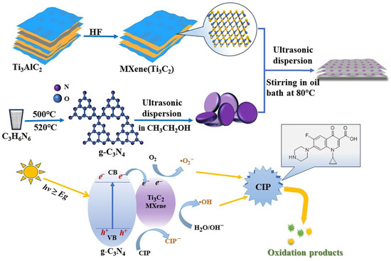 - Zhang, H.; Xu, J.; Yuan, Y.; Guo, Y.; Tan, X.; Wang, H.; Hu, X.; Tang, C. Highly conductive Ti3C2 MXene reinforced g-C3N4 heterojunction photocatalytic for the degradation of ciprofloxacin: Mechanism insight. Sep. Purif. Technol. 2024, 330, 125520. [Google Scholar] [CrossRef]