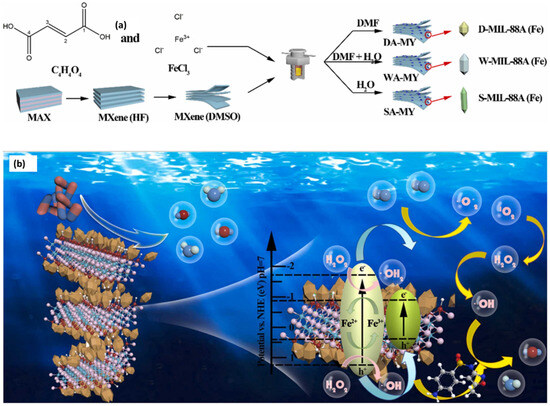 - Tan, Q.; Yu, Z.; Xiang, Q.; He, N.; Long, R.; Wang, J. Photo-Fenton properties of MIL-88A(Fe)/Ti3C2 MXene with tunable active crystal facets: Universal for degradation of common pollutants in wastewater. Process Saf. Environ. Prot. 2023, 179, 405–420. [Google Scholar] [CrossRef]