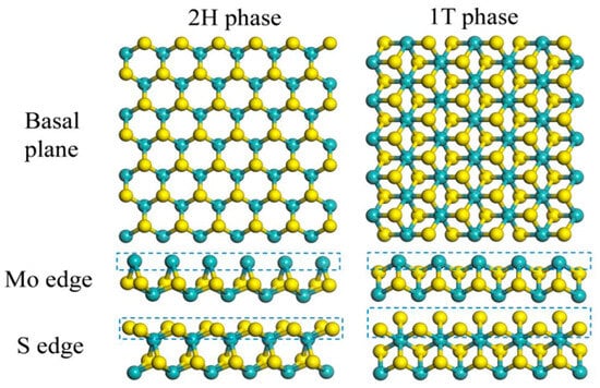 The typical ball and stick model of the 2H and 1T phases of MoS2, where pale blue represents Mo atoms and the yellow color denotes S atoms. Reproduced with permission from Ref. [35], copyright 2024, MDPI.