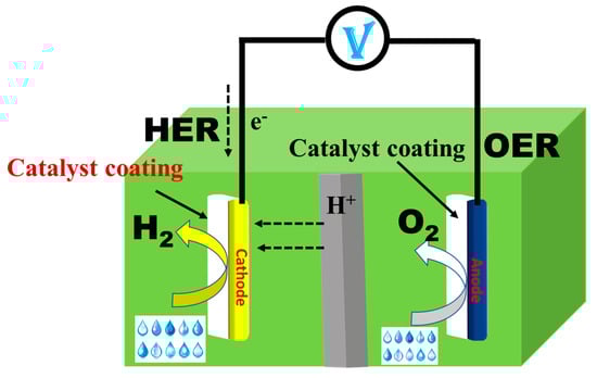 MoS2 has emerged as a promising catalyst to replace Pt-based electrocatalysts for HERs in water electrolysis due its unique layered structure, tunable electronic properties, abundance, low cost, and excellent catalytic potential and stability. However, its intrinsic HER performance is lower than that of Pt electrodes. To address this, various modifications have been dedicated to improving its HER activity, as will be discussed. A fundamental understanding of the water electrolysis mechanism is crucial. Water electrolysis consists of two half-cell reactions, where the HER takes place at the cathode and the OER takes place at the anode, as illustrated in Figure 2. To achieve efficient water splitting, appropriate catalysts are typically applied to the cathode and anode.