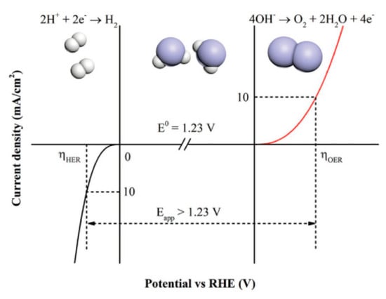 Figure 3 depicts the typical polarization curves for HERs, OERs, and their respective reactions at the cathode and anode. In addition to coating catalysts on the cathode or anode, the initiation of a water splitting reaction requires overcoming a free energy (∆G) of 237.2 kJ mol−1 at 25 °C and 1 atm, irrespective of whether the medium is acid, alkaline, or neutral. This energy corresponds to a theoretical cell voltage of 1.23 V.