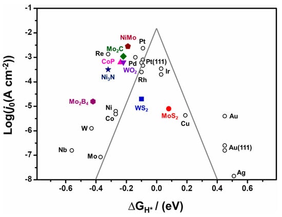 HER Volcano plot of the relationship of the exchange current density of certain metals and MoS2 and their corresponding ∆GH*. Reproduced with permission from Ref. [46], copyright 2019, Elsevier.
