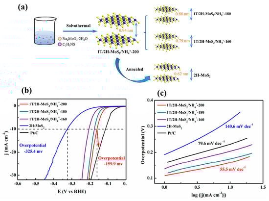The HER activity of catalysts can be improved by regulating their active sites, which can be achieved by expanding the interlayer spacing of bulk MoS2. Increasing the interlayer spacing provides more active sites, facilitates the desorption of Hads, and improves the transfer of electrons/protons [55]. Moreover, this expansion optimized the ∆GHads at both the edge and the basal planes of MoS2, facilitating intermediate Hads adsorption and hydrogen molecule desorption, thereby boosting HER efficiency [56]. Zhang et al. [57] reported the design of 1T MoS2 with expanded interlayer spacing using a simple solvothermal approach in N,N-dimethylformamide (DMF) derived from Mo-based organic frameworks (Mo-MOFs). The resulting 1T-MoS2 demonstrated efficient HER activity, achieving an overpotential of 98 mV at a current of 10 mA cm−2, along with a Tafel slope of 52 mV dec−1. Hu et al. [58] synthesized a 1T/2H-MoS2 material with an expanded interlayer spacing of 0.94 nm under reaction conditions of 200 °C in ethylene glycol (Figure 5a). This interlayer expansion was attributed to the incorporation of ammonium ions during the reaction, which creates large channels for ion transport and enhances the exposure of active sites. The resulting 1T/2H-MoS2/NH4+-200 demonstrated outstating HER performance, achieving an overpotential of 159.9 mV at 10 mA cm−2, with a Tafel slope of 55.5 mV dec−1 in 0.5 M H2SO4 (Figure 5b,c). Moreover, the material demonstrated remarkable electrochemical stability, showing only a minor drop overpotential (7.2 mV) at 10 mA cm−2 after 1000 cyclic voltammetry cycles.