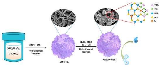 Single-atom catalysts represent a frontier in the field catalysis, gaining significant attention for their maximum atomic efficiency and tunable electronic properties. Li and co-workers [65] applied a novel single-atom catalysis approach to developed a highly active electrocatalyst with superior HER performance across a wide pH range. Initially, 2H-MoS2 was synthesized using a simple two-step hydrothermal approach. Subsequently, different amounts of noble Ru metal were incorporated into 2H-MoS2, as illustrated in Figure 6.