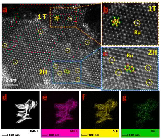 HAADF-STEM image of (a) optimized Ru0.10@2H-MoS2, (b,c) high resolution images of 1T and 2H phases decorated with Ru single atoms (marked by yellow circles), (d–g) EDS elemental mapping image of optimized Ru0.10@2H-MoS2 catalysts indicating the presence of Ru, Mo, and S atoms. Reproduced with permission from Ref. [65], copyright 2021, Elsevier.