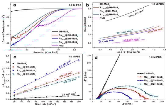 HER performance of Ru@2H-MoS2 catalysts with varying loadings of Ru in 1.0 M PBS solution at pH 7, (a) polarization curves (b) corresponding Tafel slopes, (c) the electrochemical double-layer capacitance (Cdl), and (d) electrochemical impedance spectroscopy (EIS). Reproduced with permission from Ref. [65], copyright 2021, Elsevier.