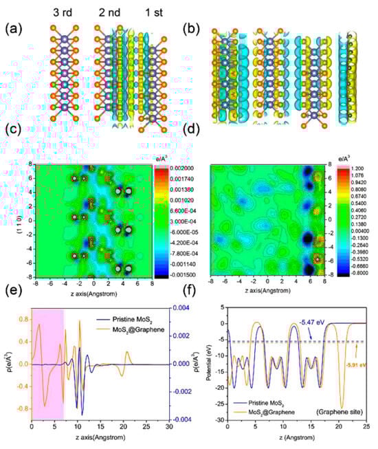 Charge density difference between (a) pristine MoS2 and (b) MoS2/graphene heterostructure. Blue color indicates depletion space and yellow color indicates accumulation space. (c,d) Plot of (110) surfaces of the charge density difference contour for pristine MoS2 and MoS2/graphene, (e) x-y plane averaged charge density, with charge density on the y-axis and distance along z-direction on the x-axis. (f) Average electrostatic potential of pristine MoS2 and MoS2/graphene. Reproduced with permission from Ref. [71], copyright 2015, Nature.
