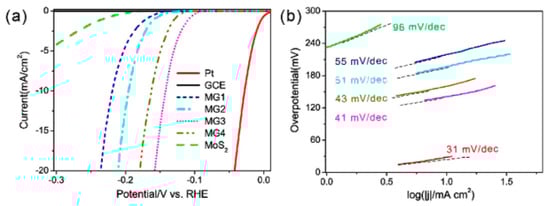 (a) Polarization curves obtained for pristine MoS2 and MoS2/graphene heterostructure at 140, 160, 180, and 200 °C (denoted MG1–4), and (b) corresponding Tafel plots. Reproduced with permission from Ref. [71], copyright 2015, Nature.
