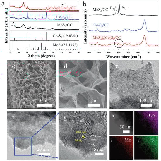 (a). XRD pattern and (b) Raman spectra of Co9S8, Co9S8/CC, MoS2/CC, and Co9S8/MoS2/CC; (c,d) SEM, (e,f) TEM, and (g) HRTEM images of Co9S8/MoS2/CC at different magnifications; and (h) corresponding EDS mapping of (i–k) Co, Mo, and S. Reproduced with permission from Ref. [76], copyright 2021, Elsevier.