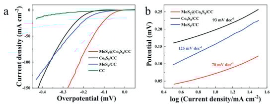 (a) HER polarization curves and (b) corresponding Tafel plots of synthesized pristine and composite catalysts (Co9S8/CC, MoS2/CC, and Co9S8/MoS2/CC). Reproduced with permission from Ref. [76], copyright 2021, Elsevier.