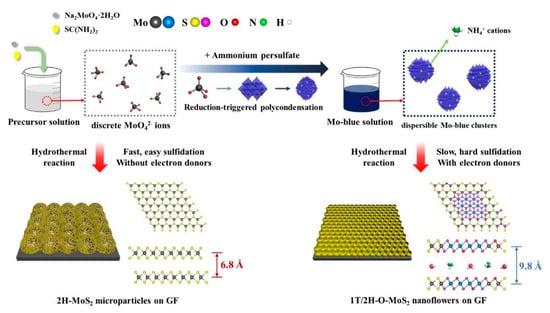 Pictorial illustration for the hydrothermal preparation of 2H-MoS2 and 1T/2H-O-MoS2 on GF. Reproduced with permission [102].