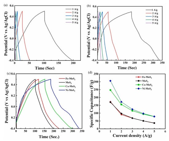 (a) GCD graphs of MoS2/CC (a) and Ni-MoS2/CC (b) at different current densities. GCD curves (c) and Csp versus current density variations (d) of Fe-MoS2-, MoS2-, Co-MoS2-, and Ni-MoS2-based electrodes. Reproduced with permission [110].
