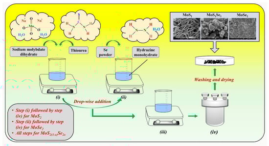 Schematic representation of the preparation of MoS2(1 − x)Se2x (x = 0, 0.25, 0.5, 0.75, and 1). Reproduced with permission [113].