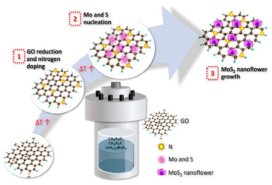 It is well known that mixed-phase MoS2 has impressive electrochemical properties, which originate from the generation of electrochemical active sites and higher structural stability compared to the other materials with a crystalline nature. In this connection, Bokhari et al. [129] reported the one-pot synthesis of N-doped, rGO-modified, mixed-phase (MP) MoS2 nanoflowers (NGM). The preparation of the electrode material can be seen in Figure 18. The NGM composite-based electrode exhibited a Csp of 539.5 F/g and a power density of 25.4 kW/kg. It was stated that the robust ion transport and low charge transfer resistance at the electrode–electrolyte interface may boost the electrochemical charge storage properties of the NGM-based electrode.