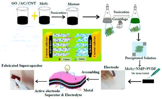 Wang et al. [130] obtained a Csp of 392 F/g at 5 mV/s using a hydrothermally prepared MoS2/graphene composite modified electrode. Authors also obtained a Csp of 76 F/g at 5 mV/s for a 2D printing-based fabrication process using MoS2/graphene ink. Pilathottathil et al. [131] prepared AC/MoS2, graphene/MoS2, and MWCNTs/MoS2 using benign approaches. The fabrication of SC devices are demonstrated in Figure 19. Authors observed that AC/MoS2 has superior electrochemical properties and exhibited a decent Csp of 216 F/g with an energy density of 6.2 Wh/kg. In contrast, graphene/MoS2 showed a Csp of 202 F/g, whereas MWCNTs/MoS2 exhibited a Csp of 161 F/g.
