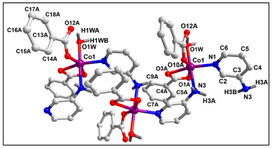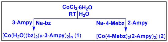 3.1.1. Synthesis of [Co(H2O)(bz)2(μ-3-Ampy)2]n (1)