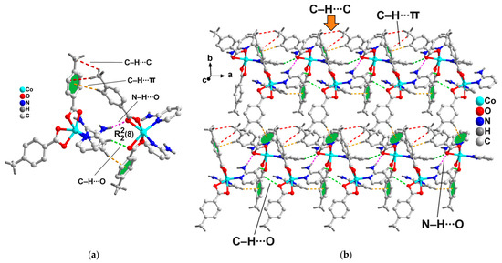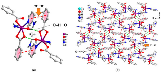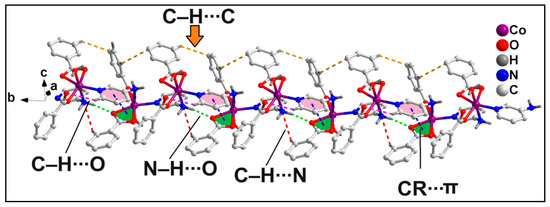 The most important criterion for supramolecular association is the non-covalent interactions, leading to a wide rangeof captivating network architectures and properties with befitting potential applications [35,36,37]. The investigation of non-covalent interactions in metal–organic compounds has received substantial attention, with a special focus on illuminating the mechanical properties and spatial organization of supramolecular assemblies [38]. Supramolecular self-assembly is an effective strategy for constructing metal–organic compounds and well-organized structures by employing various synthetic approaches and enabling the development of functional metal–organic compounds [39,40]. Among all types of non-covalent interactions, hydrogen bonding stands out as a powerful device in the creation of molecular solids due to its directional nature, selectivity, and reversible formation at ambient conditions [41]. Its contribution has been the key to the stabilization of supramolecular architectures [42]. Beyond the prominent hydrogen bonding networks exemplified by O–H⋯O and N–H⋯O, the subtle yet influential weak intermolecular C–H⋯N hydrogen bonding interactions significantly contribute to the stability of crystal structures [43,44,45,46,47,48]. Aromatic π-stacking interactions and interactions involving metal–ligand chelate ring(CR) also influence the supramolecular architectures in coordination compounds, thus emphasizing their vital significance not only in self-assembly but also in the investigation of the properties of functional materials [49,50,51,52]. In addition, the C–H⋯π interactions with aromatic π systems have been shown to play significant roles in various fields of chemistry including crystal packing and biological systems [53].