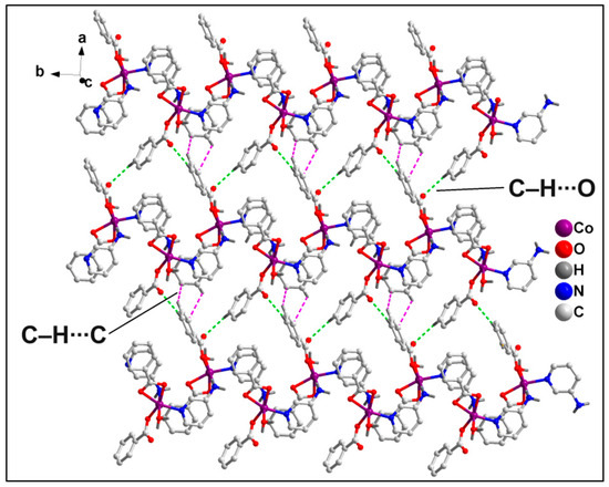 The supramolecular layers, extending along the ac-plane are formed through the linkage of adjacent 1D chains of compound 2 along the crystallographic a-axis via C–H⋯O hydrogen bonding and C–H⋯π interactions (Figure 7). C–H⋯O interactions are established between the –C24H24B fragment and O2 atom of 4-Mebz from two neighboring monomeric complex units with C24–H24B⋯O2 distance of 2.64(7) Å. Moreover, the –C7H7 moiety of 4-Mebz is involved in C–H⋯π interactions with the π-system of 2-Ampy from two adjacent monomers with centroid(C14-C18, N1)–H7 separation of 2.73(1) Å.