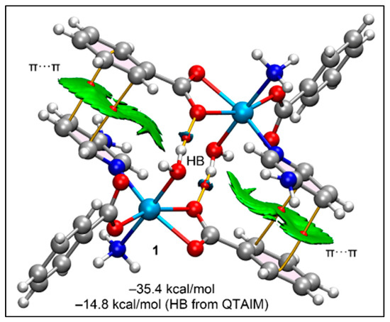 The QTAIM/NCI plot analysis of a self-assembled dimer of the model for compound 1 (Figure 4a), designed to replicate the interactions seen in the self-assembly of the 1D polymeric chains, is illustrated in Figure 11 (see Table S2 for QTAIM parameters). This analysis shows that each π-stacking interaction is characterized by two bond critical points (BCPs, depicted as small red spheres) and bond paths (represented by orange lines) that connect two carbon atoms from the benzoate and 3-Ampy rings. The strong compatibility between the two rings is further underscored by a significant “reduced density gradient” (RDG) isosurface situated between them, corroborating the MEP surface analysis which indicated the strong ability to form π⋯π stacking due to the opposite electronic nature of the π-systems (one being electron-rich and the other electron-poor). Furthermore, the NCI plot analysis reveals two symmetrically equivalent BCPs and bond paths that characterize the O–H⋯O hydrogen bonds, each marked by blue RDG isosurfaces that signify the strength of these bonds. The robustness of these hydrogen bonds is verified by the QTAIM parameters, with a calculated strength of −14.8 kcal/mol. The total interaction energy, amounting to −35.4 kcal/mol, affirms the predominance of the π-stacking interactions, which are found to be even more significant than the hydrogen bonds in stabilizing the assembly.