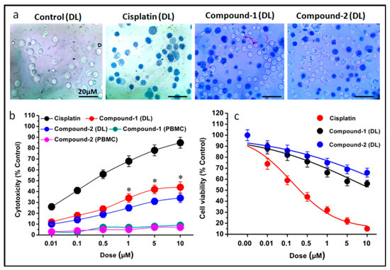 (a) Cytotoxic evaluation in DL cell line after 24-h treatment with varying concentrations of Compound 1 and Compound 2. Dead cells are stained, while viable cells remain unstained. (b) Cell cytotoxicity (%) in normal (PBMC) and cancerous (DL) cells treated with different dosages of Compound 1 and Compound 2. (c) Percentage of cell viability in DL cells following treatment with varying dosages of Compound 1 and Compound 2. For positive control, cisplatin was considered. Data are mean ± S.D., n = 3, one-way ANOVA, * p ≤ 0.05.