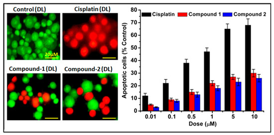 Fluorescence microscopy of DL cells showing distinct morphological features. Control cells display green nuclei, indicating viability. Cells treated with cisplatin (reference drug) exhibit red/orange nuclei, characteristic of apoptosis. Treatment with compound 1 and compound 2 results in apoptotic cells with visible membrane damage and blebbing. Apoptotic cells (in %) after treatment with compounds 1 and 2 showing dose-dependent increase in percent apoptotic cells. Data presented as mean ± S.D., n = 3.