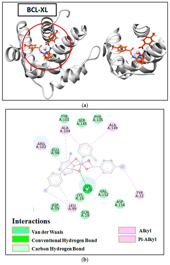 (a) Docking structure of compound 2 with the BCL-XL receptor, highlighting the interactions between the receptor and compound within the active sites; (b) Key binding interactions are depicted to provide insights into the molecular mechanism of action.