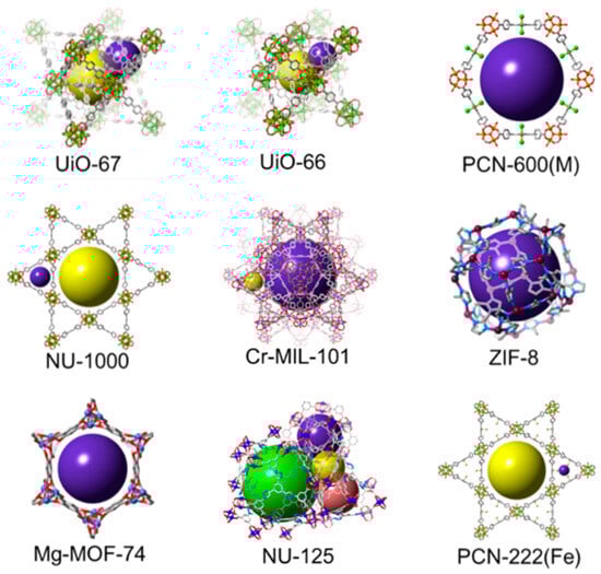 Schematic representations of MOF structures. Zr: green; Fe: yellow; Cr: purple; Zn: dark red; Mg: blue; Cu: royal blue; C: gray; O: red; N: light blue; Cl: pink [61]. Copyright 2017, Chemistry of Materials.