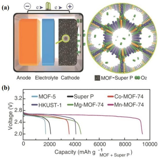 (a) Schematic illustration of a Li-O2 cell using MOF–Super P composite as the O2 electrode. Oxygen molecules’ relative sizes reduced for clarity. (b) Discharge profiles of the Li-O2 cells using MOF–Super P composites or Super P only under O2 atmosphere with a current of 50 mA g−1 at room temperature [63]. Copyright 2014, Advanced Materials.
