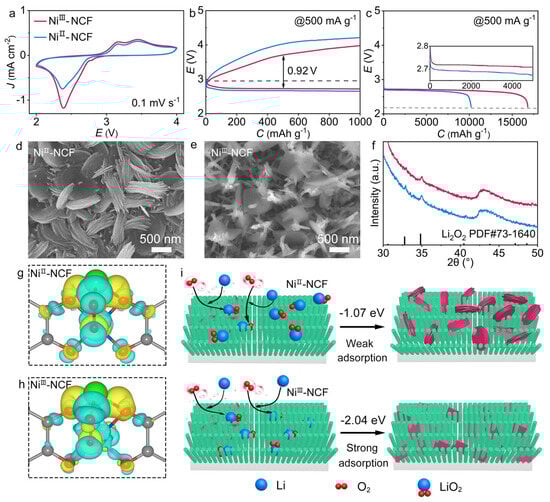 (a) CV curves of NiIII–NCF and NiII–NCF cathodes at 0.1 mV s−1 within 2.0–4.0 V. (b) First discharge/charge curves of Li-O2 batteries with NiIII–NCF and NiII–NCF cathodes with a capacity limit of 1000 mAh g−1 at 500 mA g−1. (c) Deep discharge curves of Li-O2 batteries with NiIII–NCF and NiII–NCF cathodes. (d,e) SEM images of discharged NiII–NCF and NiIII–NCF cathodes with a capacity limit of 2000 mAh g−1 at 100 mA g−1. (f) XRD patterns of discharged NiIII–NCF and NiII–NCF cathodes. (g,h) Differential charge densities of LiO2–adsorbed NiIII–NCF and NiII–NCF. Cyan and yellow represent charge depletion and accumulation, respectively. The isosurface value is set to 0.003 e bohr−3. (i) Discharge mechanism on NiIII–NCF and NiII–NCF cathodes [64]. Copyright 2022, Angewandte Chemie International Edition.