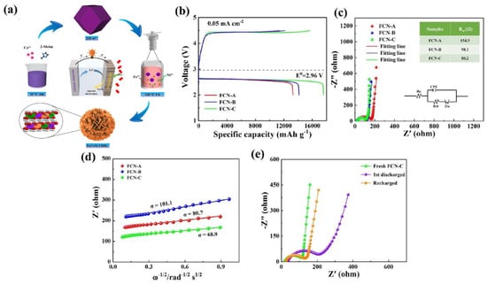 (a) Illustration for the preparation of FCN catalysts. (b) The full discharge–charge curves of different FCN–based catalysts at 0.05 mA cm−2. (c) Linear fits in low–frequency regions for FCN–based catalysts. (d) Comparison of Tafel slopes for FCN–A, FCN–B and FCN–C. (e) EIS spectra of FCN–C cathode after the 1st discharged and recharged processes. [65]. Copyright 2024, Journal of Industrial and Engineering Chemistry.