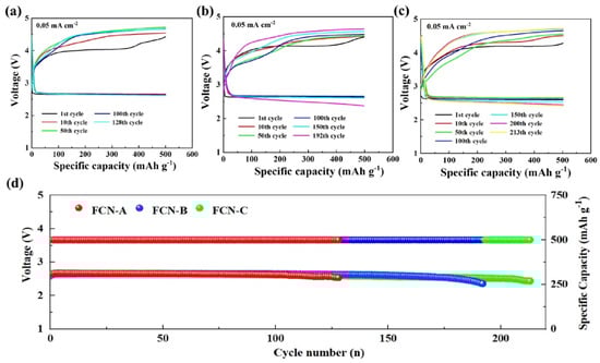 Cycling performance of the LOBs battery assembled with different cathodes: (a) FCN–A; (b) FCN–B; (c) FCN–C with the fixed capacities of 500 mAh g−1 at 0.05 mA cm−2. (d) The change in corresponding discharge terminal voltages for different cycle numbers [65]. Copyright 2024, Journal of Industrial and Engineering Chemistry.