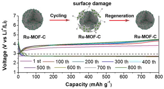 Meng et al. [66] created a novel carbon composite, originating from a metal–organic framework (MOF) embedded with three-dimensional ruthenium nanoparticles, designed to act as a dependable oxygen catalyst for applications requiring low-oxygen respiration. This composite exhibits notable catalytic activity along with superior long-term stability. When operated at a current density of 500 mA g−1, the cells maintain consistent charge and discharge cycles for as many as 800 cycles (~107 days), while also showcasing minimal overpotentials during discharge (~0.2 V) and charge (~0.7 V) relative to lithium (Figure 7). The remarkable cycling stability of the lithium–oxygen batteries (LOBs) utilizing the Ru-MOF-C catalyst is proposed to be due to a regenerative surface mechanism.