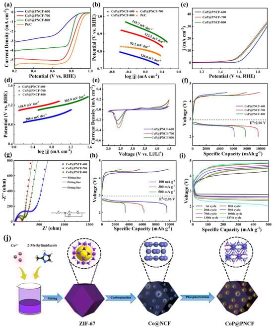 (a) ORR polarization curves and (b) Tafel plots of CoP@PNCFs in O2–saturated 0.1 M KOH electrolyte at 1600 rpm. (c) OER polarization curves and (d) Tafel plots of different CoP@PNCF samples in O2–saturated 0.1 M KOH electrolyte. (e) CV tests at 0.1 mV s−1 for CoP@PNCFs cathode catalysts. (f) Full discharge/charge plots of CoP@PNCFs electrodes at 100 mA g−1. (g) EIS plots of CoP@PNCFs. (h) Full discharge/charge plots of CoP@PNCF–700 electrode at different current densities. (i) CoP@PNCF–700 electrode with different cycles at 200 mA g−1 with a fixed capacity of 500 mA h g−1. (j) Schematic process of designing the Co@NCF and CoP@PNCF catalysts [67]. Copyright 2023, Journal of Energy Storage.