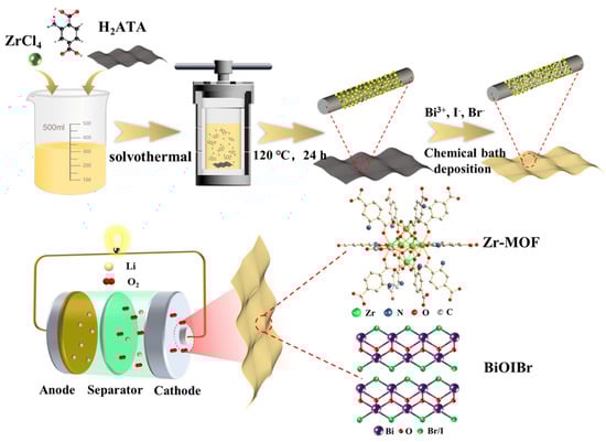 Zhang et al. [109] fabricated a freestanding, flexible Co-MOF/MXene hybrid film to serve as a cathodic catalyst in Li-O2 batteries, effectively catalyzing the oxygen reduction reaction (ORR). This Co-MOF/MXene heterostructured film, characterized by its two-dimensional layered architecture, demonstrates exceptional ORR catalytic activity. It offers accelerated pathways for Li+ or O2 movement, aiding in the deposition and breakdown of Li2O2. Moreover, this approach deviates from the conventional slurry preparation method for Li-O2 cathodes, representing an innovative concept for the development of next-generation batteries. Li-O2 batteries equipped with Co-MOF/MXene hybrid films as cathodes showcase an ultra-high capacity (34,763 mAh g−1 at a current density of 1000 mA g−1), outstanding cycling stability (over 278 cycles with a consistent capacity of 1000 mAh g−1 at a current density of 1000 mA g−1), and remarkable rate performance. Zhu et al. [110] developed CoFe-LDH@CNTs electrodes, which, when utilized as cathodes in LOBs, demonstrated a high initial discharge capacity (32,800 mAh g−1 at 500 mA g−1) and sustained 176 stable cycles at a capacity limit of 500 mAh g−1 at 500 mA g−1. Tao et al. [111] designed a bismuth oxyhalide heterojunction composite, doped with a metal–organic framework (MOF) on carbon cloth, named Zr-MOF/BiOIBr/CC, to act as an efficient bifunctional catalyst for boosting oxygen electrode reactions in photo-assisted Li-O2 batteries (LOBs) (Figure 9). The photo-assisted Li-O2 batteries equipped with the Zr-MOF/BiOIBr/CC cathode exhibited a discharge potential of 3.05 V, a reduced charge potential of 3.20 V, and an impressive energy efficiency of up to 95.3%. Furthermore, these batteries achieved an extended cycle life, enduring more than 255 cycles.