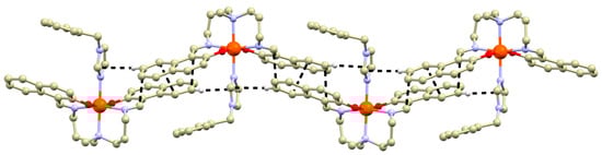 The non-covalent interactions stabilizing crystal structures of 1a, 2b–4b are mostly weak and without strong interactions interconnecting the complex cations. One exception is the crystal structure of 4b, in which the complex cations are interconnected via offset face-to-face π-π stacking between the naphthalene rings of the neighboring complex cations combined with face-to-edge interaction between naphthalene ring and bylim ligand (Figure 2). Such interactions could potentially increase SCO cooperativity, as has been shown in numerous examples previously [21].
