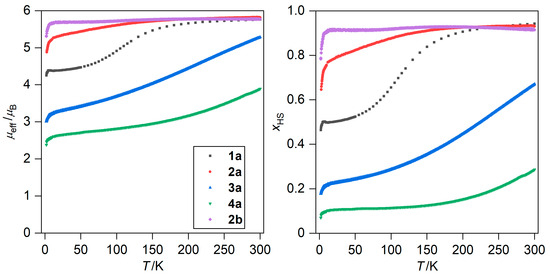 Temperature dependence of μeff/μB for 1a–4a and 2b (left) and calculated dependence of the molar fraction of the high-spin state, xHS, assuming gHS = 2.0 and gLS = 2.15 (right).