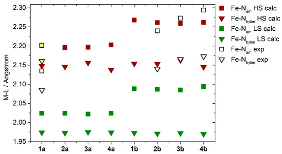 The calculated HS structures show reasonable agreement with the experimental structures, as demonstrated by a comparison of the metal–ligand bond lengths (Figure 4). The Fe–Nam bonds, which are the most sensitive to SCO effects in this group of compounds [8], show interesting features in both spin states. Their lengths are slightly longer in 1b–4b than in 1a–4a structures (≈2.25 vs. 2.20 Å in the HS state vs. ≈2.08 vs. 2.03 Å in the LS state, Figure 4). Obviously, the consequence of this prolongation should lead to a weaker ligand field in 1b–4b than in 1a–4a [35].