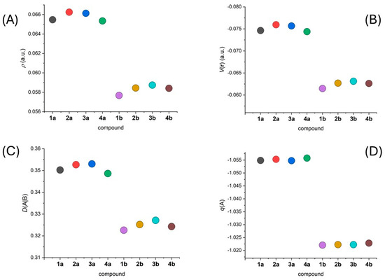 Graphical depiction of the calculated values for the following parameters: (A) ρ(r), (B) V(r), and (C) D(A|B) at the (3,−1) bond critical point of the Fe–Nam bond in 1a–4b, and (D) q(A) over the basin of the Nam atom.