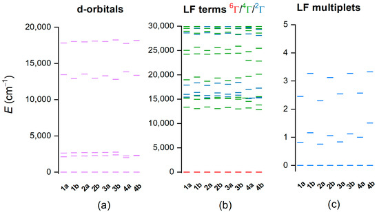 Furthermore, the post-Hartree–Fock method, CASSCF/NEVPT2, was employed to more deeply evaluate the electronic structure of these complexes. First, the respective calculations were carried out for 1a–4b complexes in the HS state using the active space defined by five electrons in five d-orbitals, CAS(5e,5o)—Figure 6. Ab initio ligand field theory [37,38] was used to calculate energies of d-orbitals (Figure 6a), which correspond to pseudo-octahedral geometry. The first three d-orbitals represent “t2g” orbitals (dxy, dxz, dyz), and the next two orbitals are “eg” orbitals (dx2-y2, dz2). There is an evident variation of energy of the fourth d-orbital; energies are slightly higher for 1b–4b complex (ca 13,450–13,830 cm−1) than for 1a–4a complexes (ca 12,800–13,350 cm−1). This orbital is oriented along Nam-Fe-Nbylim coordination bonds, and thus, the variation of the energy is related to the presence/absence of methyl group on the Nam atom—Figure S8. The calculations correctly found the sextet ligand-field term to be the ground state with excited terms of lower multiplicities located above ca 13,000 cm−1 (Figure 6b). As expected, the zero-field splitting of the ground state sextet due to the spin–orbit coupling is small, as shown in Figure 6c.